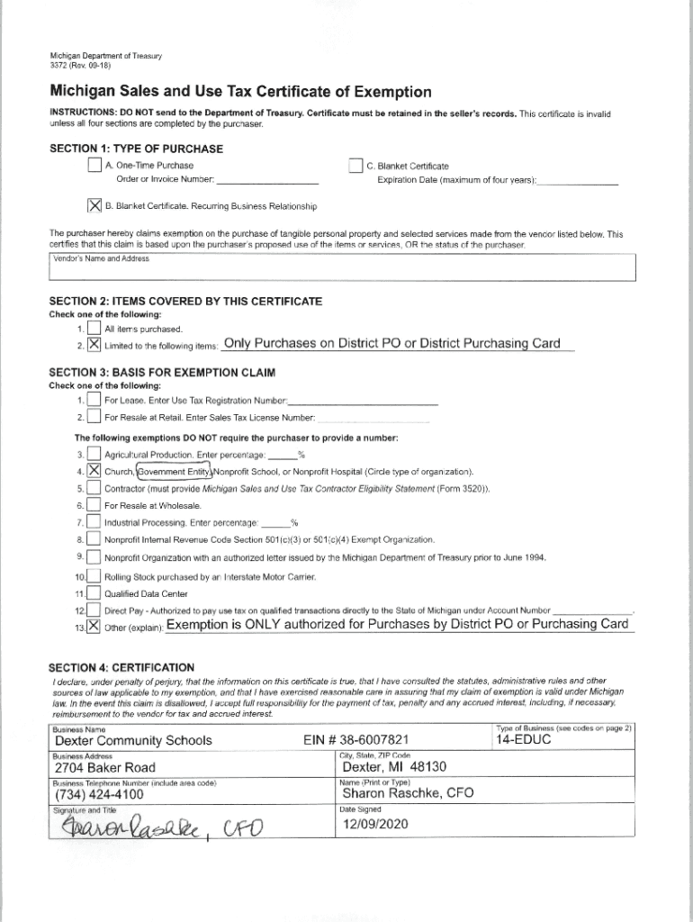Michigan Department of Treasury 3372 (Rev. 0918)Michigan Sales and Use Tax Certificate of Exemption INSTRUCTIONS: DO NOT send to the Department of Treasury. Certificate must be retained in the seller\'s