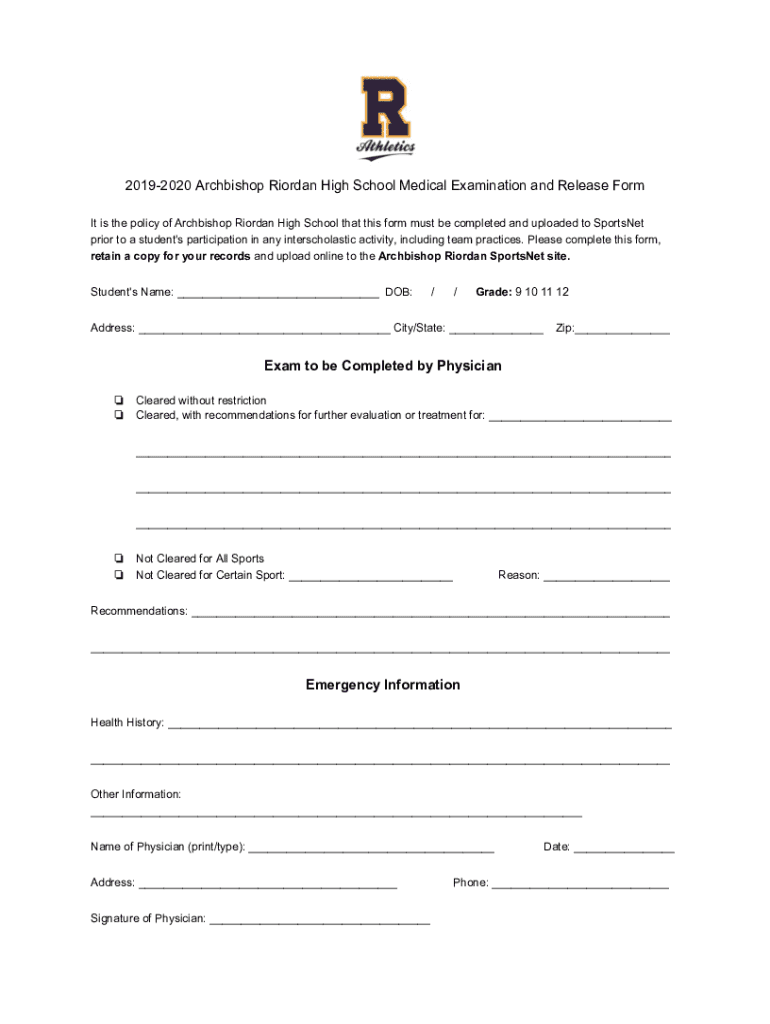 20192020 Archbishop Riordan High School Medical Examination and Release Form It is the policy of Archbishop Riordan High School that this form must be completed and uploaded to Sportsnet prior to