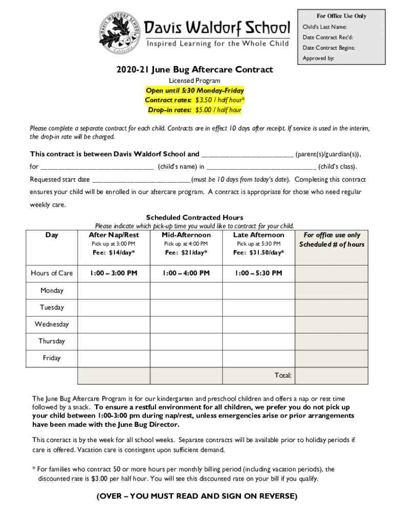 For Office Use Only Child's Last Name: Date Contract Recd: Date Contract Begins: Approved by:202021 June Bug Aftercare Contract Licensed Program Open until 5:30 Monday Friday Contract rates: $3.50
