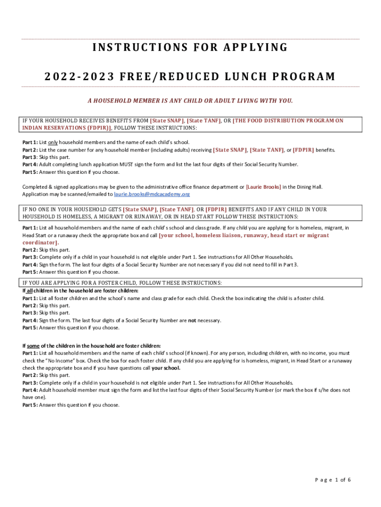 INSTRUCTIONS FOR APPLYING 20222023 FREE/REDUCED LUNCH PROGRAM A HOUSEHOLD MEMBER IS ANY CHILD OR ADULT LIVING WITH YOU. IF YOUR HOUSEHOLD RECEIVES BENEFITS FROM [State SNAP], [State TANK], OR [THE