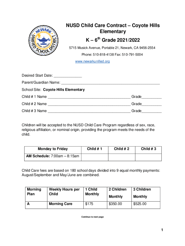 NUS Child Care Contract Coyote Hills Elementary K 6th Grade 2021/2022 5715 Music Avenue, Portable 21, Newark, CA 94562554 Phone: 5108184138 Fax: 5107915004 www.newarkunified.orgDesired Start Date: