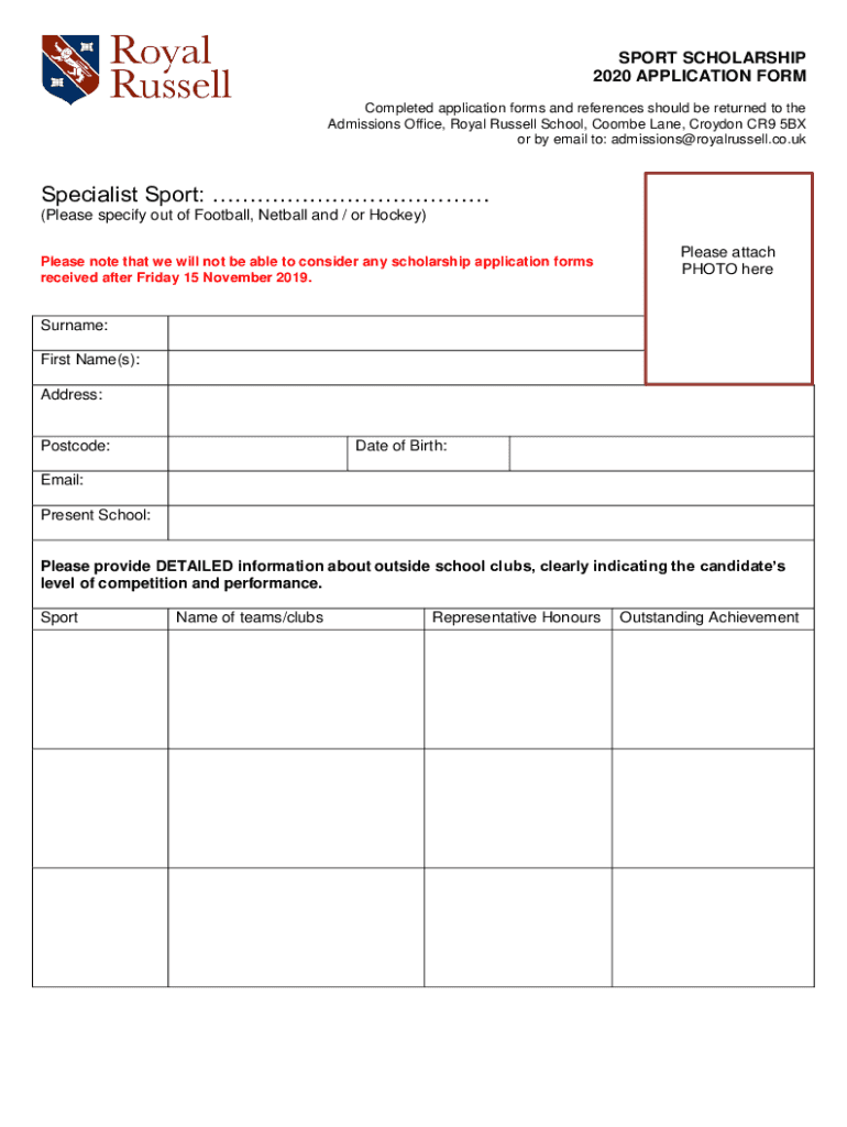 SPORT SCHOLARSHIP 2020 APPLICATION FORM Completed application forms and references should be returned to the Admissions Office, Royal Russell School, Come Lane, Croydon CR9 5BX or by email to: admissions@royalrussell.co.ukSpecialist
