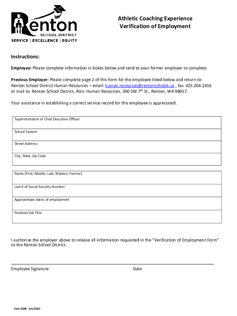 Athletic Coaching Experience Verification of EmploymentInstructions: Employee: Please complete information in boxes below and send to your former employer to complete. Previous Employer: Please complete