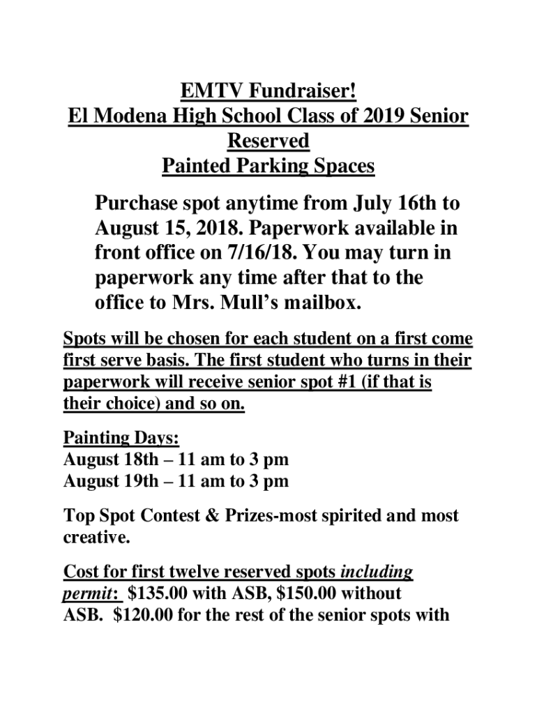 MTV Fundraiser! El Modena High School Class of 2019 Senior Reserved Painted Parking Spaces Purchase spot anytime from July 16th to August 15, 2018. Paperwork available in front office on 7/16/18.