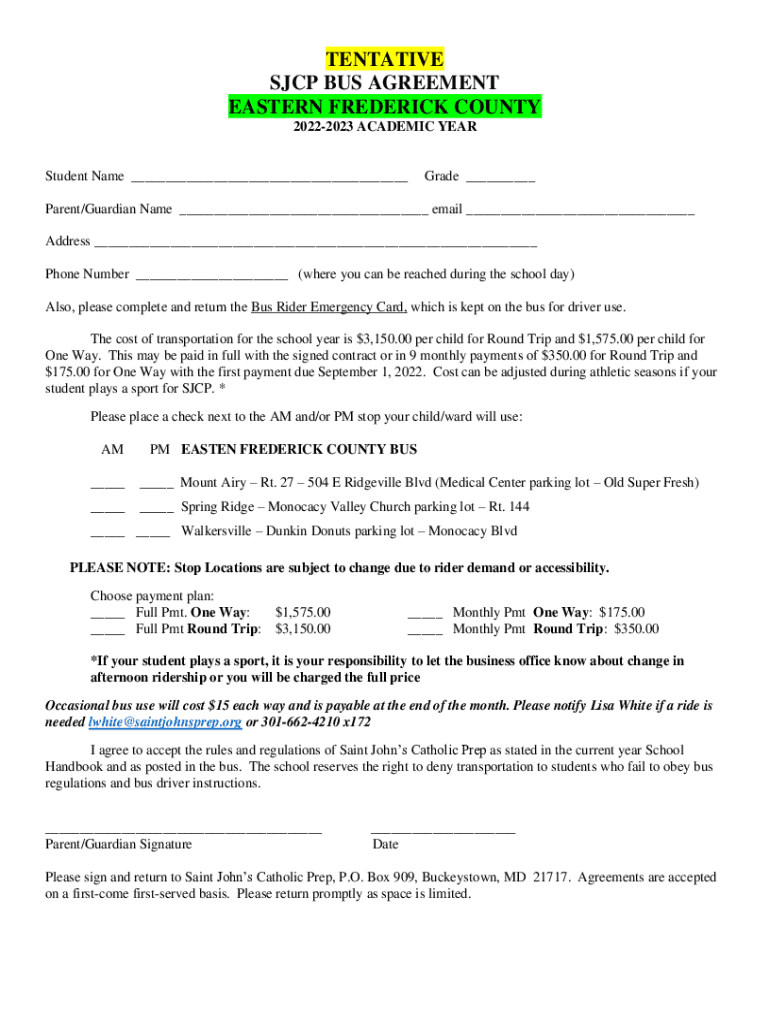 TENTATIVE JCP BUS AGREEMENT EASTERN FREDERICK COUNTY 20222023 ACADEMIC YEARStudent Name ___Grade ___Parent/Guardian Name ___ email ___ Address ___ Phone Number ___ (where you can be reached during