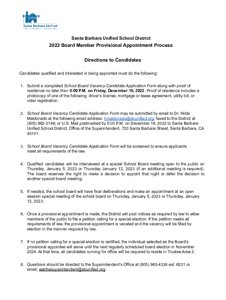 Santa Barbara Unified School District2022 Board Member Provisional Appointment Process Directions to Candidates qualified and interested in being appointed must do the following: 1. Submit a completed