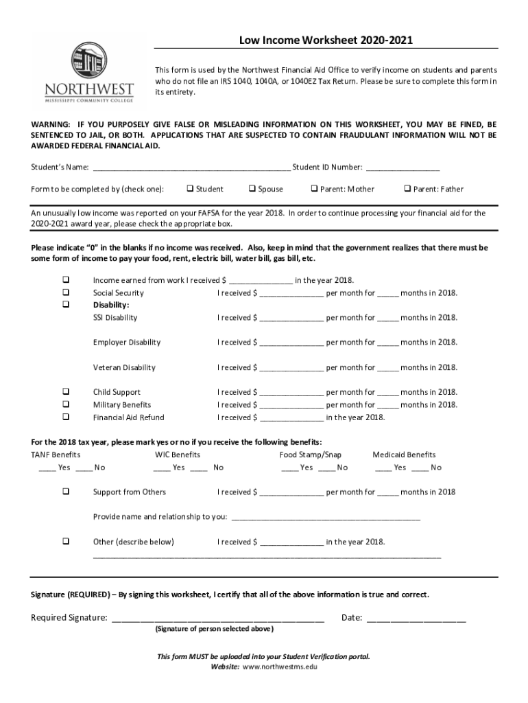 Low Income Worksheet 20202021 This form is used by the Northwest Financial Aid Office to verify income on students and parents who do not file an IRS 1040, 1040A, or 1040EZ Tax Return. Please be sure