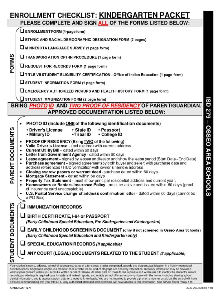 ENROLLMENT CHECKLIST: KINDERGARTEN PACKET PLEASE COMPLETE AND SIGN All the FORMS LISTED BELOW:FORMS ENROLLMENT FORM (4page form) ETHNIC AND RACIAL DEMOGRAPHIC DESIGNATION FORM (2 pages) MINNESOTA
