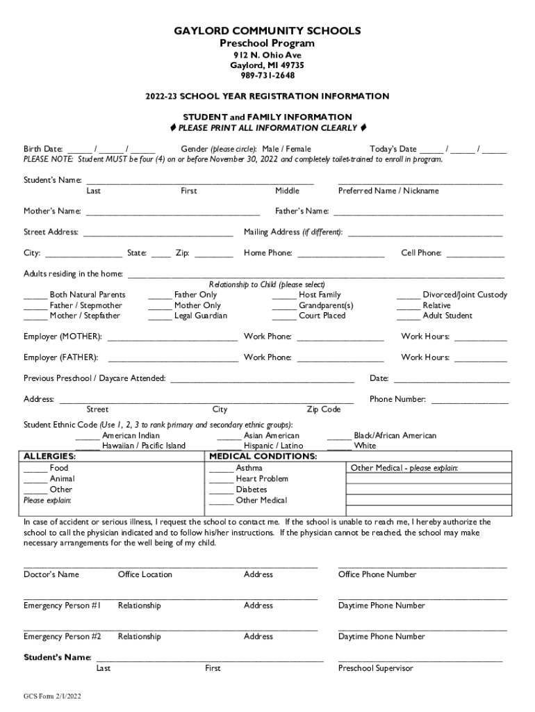 GAYLORD COMMUNITY SCHOOLS Preschool Program 912 N. Ohio Ave Gaylord, MI 49735 9897312648202223 SCHOOL YEAR REGISTRATION INFORMATION STUDENT and FAMILY INFORMATION PLEASE PRINT ALL INFORMATION CLEARLY