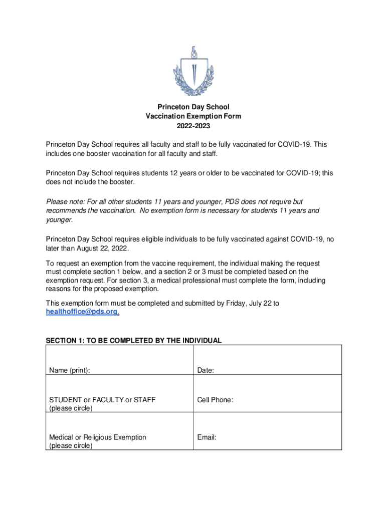 Princeton Day School Vaccination Exemption Form 20222023 Princeton Day School requires all faculty and staff to be fully vaccinated for COVID-19. This includes one booster vaccination for all faculty