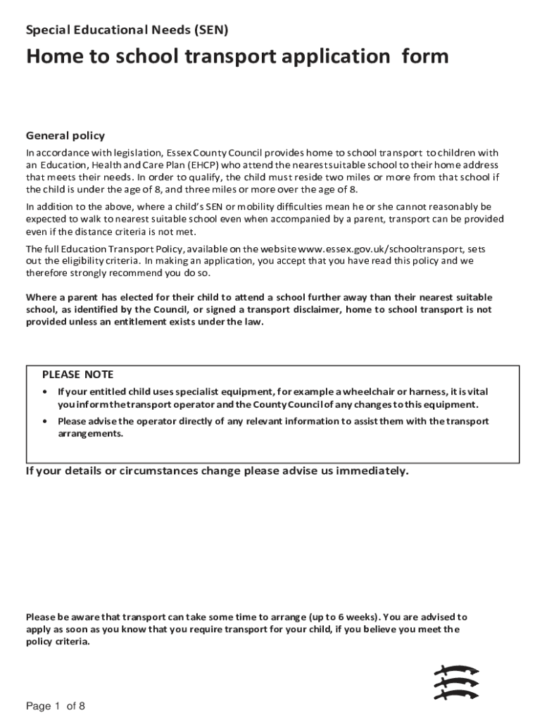 Special Educational Needs (SEN)Home to school transport application formGeneral policy In accordance with legislation, Essex County Council provides home to school transport to children with an Education,