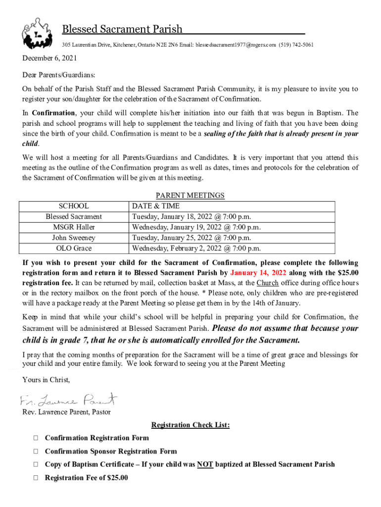 Blessed Sacrament Parish___ 305 Laurentian Drive, Kitchener, Ontario N2E 2N6 Email: blessedsacrament1977@rogers.com (519) 7425061December 6, 2021 Dear Parents/Guardians: On behalf of the Parish Staff