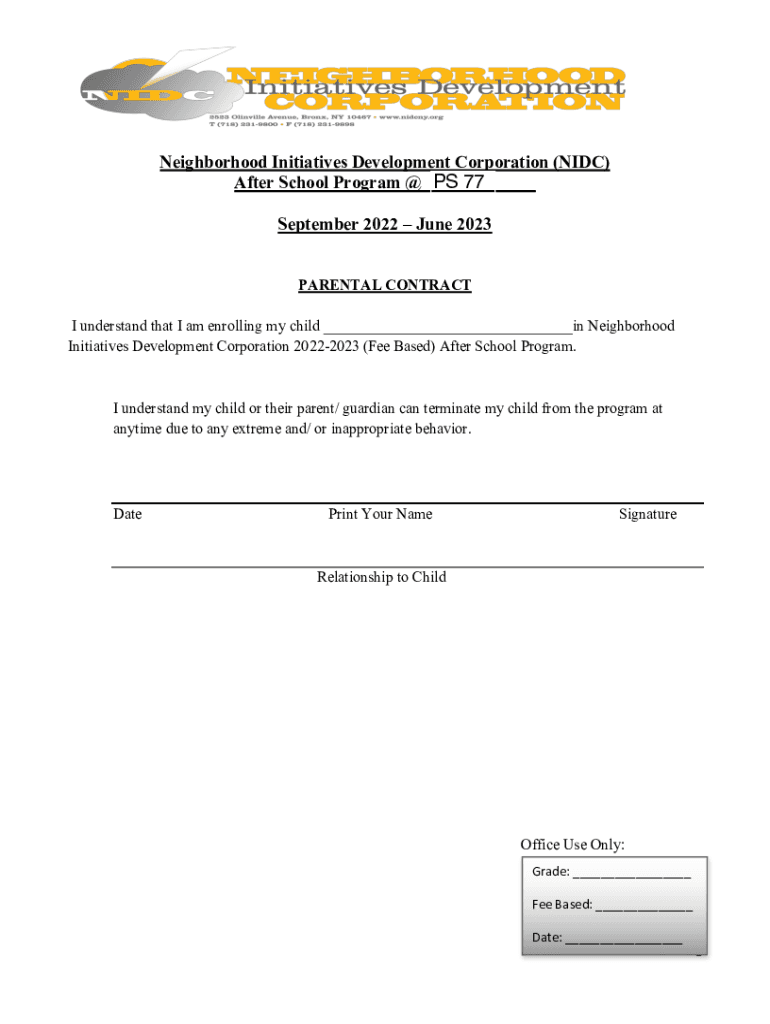 Neighborhood Initiatives Development Corporation (IDC) After School Program @___ September 2022 June 2023 PARENTAL CONTRACT I understand that I am enrolling my child ___in Neighborhood Initiatives