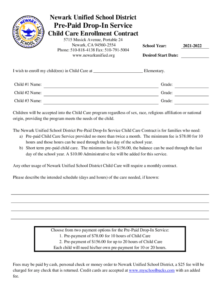 Newark Unified School DistrictPrePaid Drop In Service Child Care Enrollment Contract 5715 Music Avenue, Portable 24 Newark, CA 945602554 Phone: 5108184138 Fax: 5107915004 www.newarkunified.orgSchool