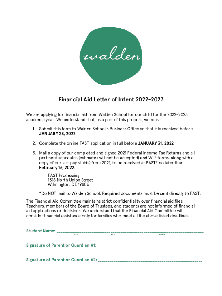 Financial Aid Letter of Intent 20222023 We are applying for financial aid from Walden School for our child for the 20222023 academic year. We understand that, as a part of this process, we must: 1.