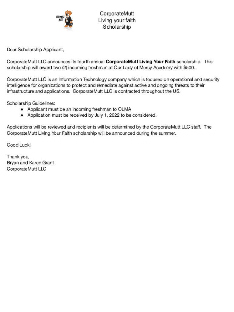 CorporateMutt Living your faith ScholarshipDear Scholarship Applicant, CorporateMutt LLC announces its fourth annual CorporateMutt Living Your Faith scholarship. This scholarship will award two (2)