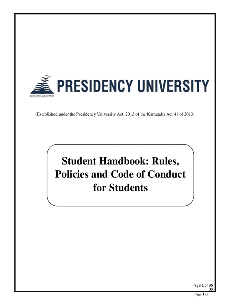 (Established under the Presidency University Act, 2013 of the Karnataka Act 41 of 2013)Student Handbook: Rules, Policies and Code of Conduct for Students Page 1 of 35 35-Page 1 of[Left Blank Intentionally]Page