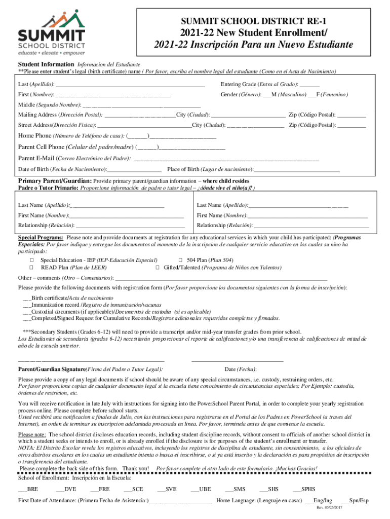 SUMMIT SCHOOL DISTRICT RE1202122 New Student Enrollment/ 202122 Inscription Para un Nero Estudiante Student Information del Estudiante **Please enter students legal (birth certificate) name / POR