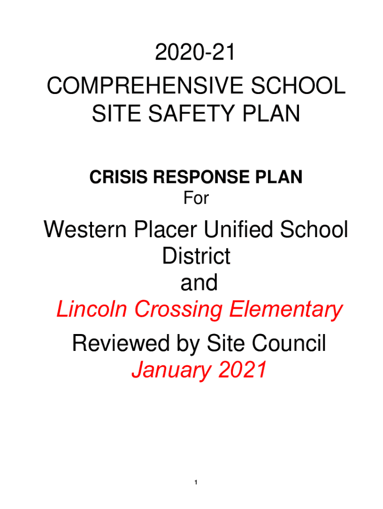 202021 COMPREHENSIVE SCHOOL SITE SAFETY PLAN CRISIS RESPONSE Plans For Western Placer Unified School District and Lincoln Crossing Elementary Reviewed by Site Council January 20211Table of Contents