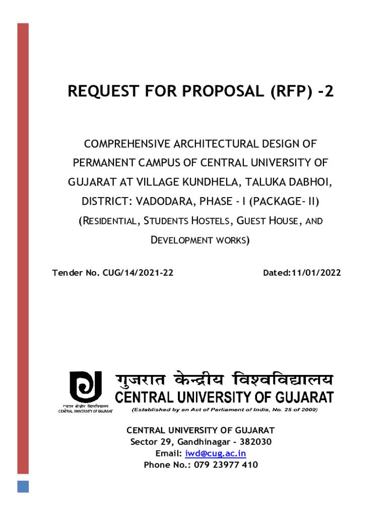 REQUEST FOR PROPOSAL (RFP) 2 COMPREHENSIVE ARCHITECTURAL DESIGN OF PERMANENT CAMPUS OF CENTRAL UNIVERSITY OF GUJARAT AT VILLAGE HANDHELD, TALK DAB HOI, DISTRICT: VADODARA, PHASE I (PACKAGE II) (RESIDENTIAL,