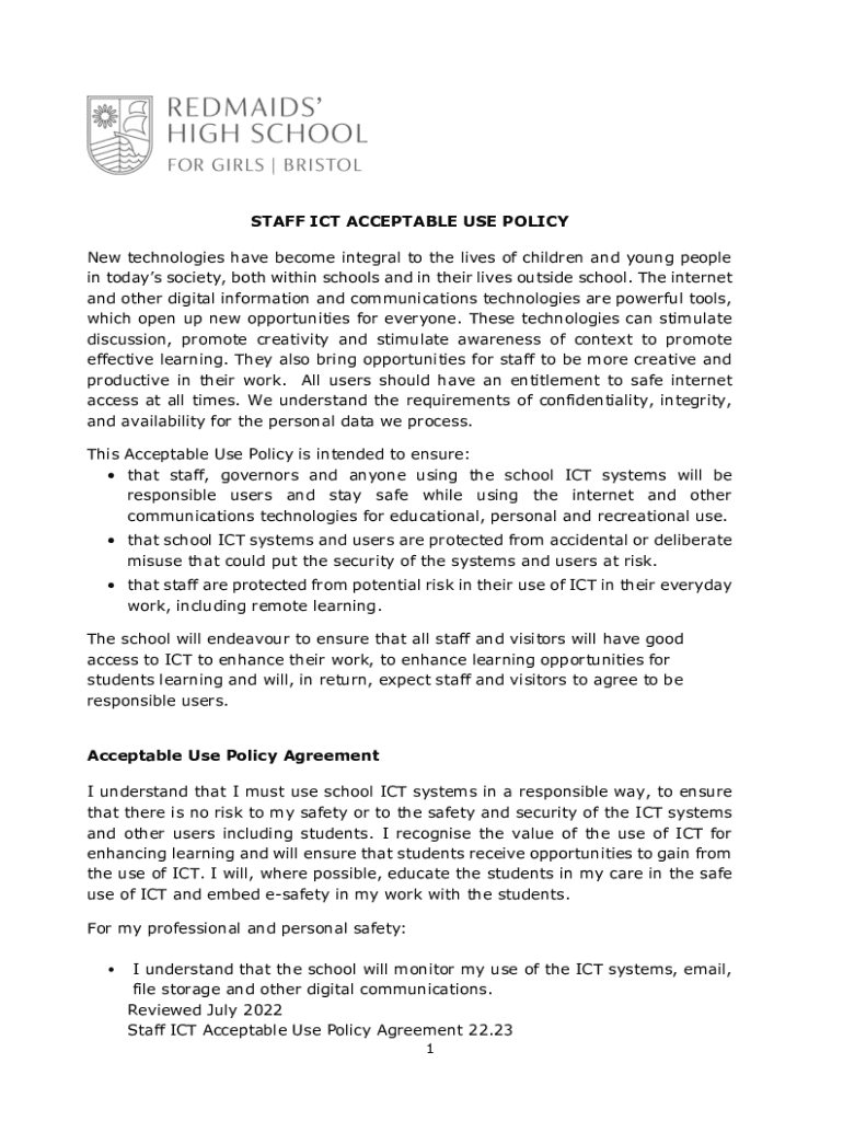 STAFF ICT ACCEPTABLE USE POLICY New technologies have become integral to the lives of children and young people in today's society, both within schools and in their lives outside school. The internet