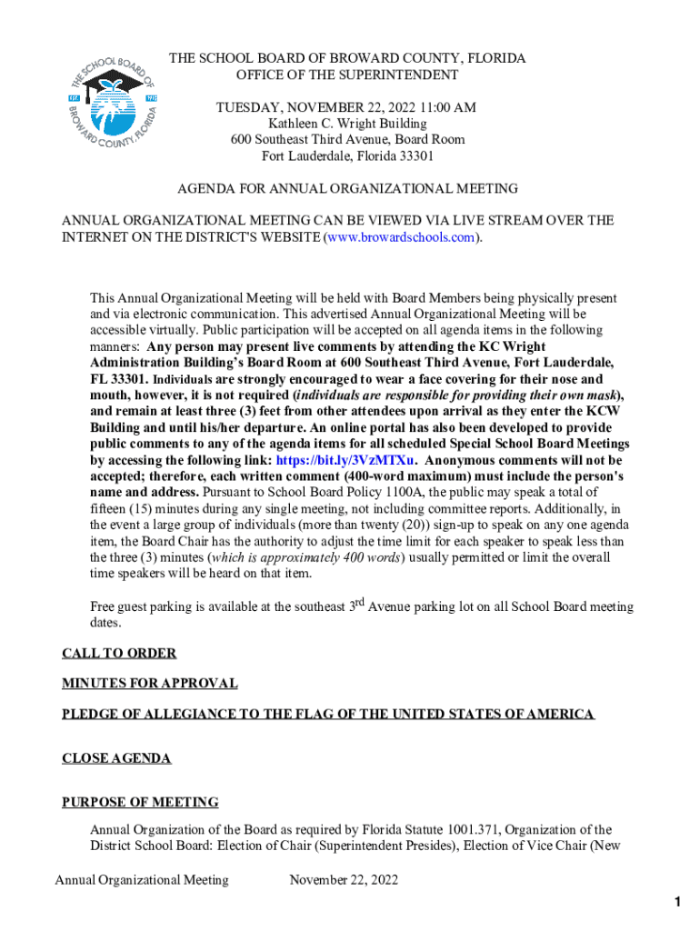 THE SCHOOL BOARD OF BROWARD COUNTY, FLORIDA OFFICE OF THE SUPERINTENDENT TUESDAY, NOVEMBER 22, 2023 11:00 AM Kathleen C. Wright Building 600 Southeast Third Avenue, Board Room Fort Lauderdale, Florida