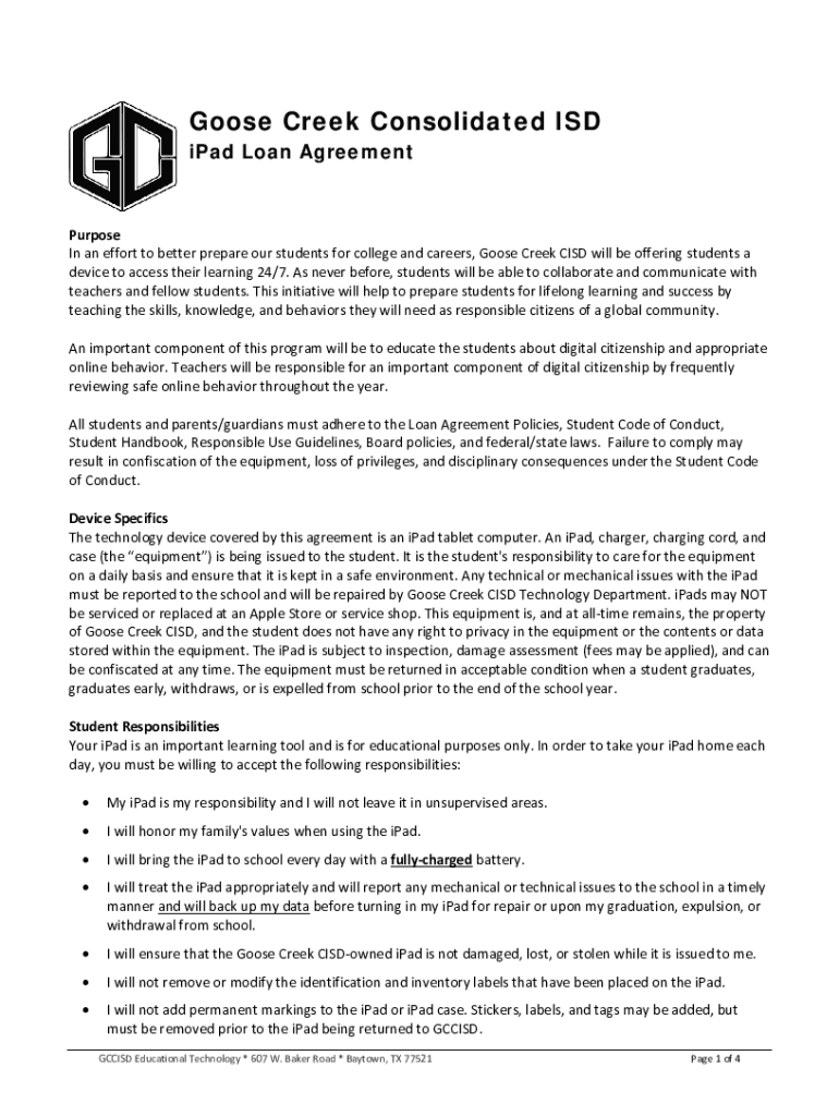 Goose Creek Consolidated ISD iPad Loan AgreementPurpose In an effort to better prepare our students for college and careers, Goose Creek CSD will be offering students a device to access their learning