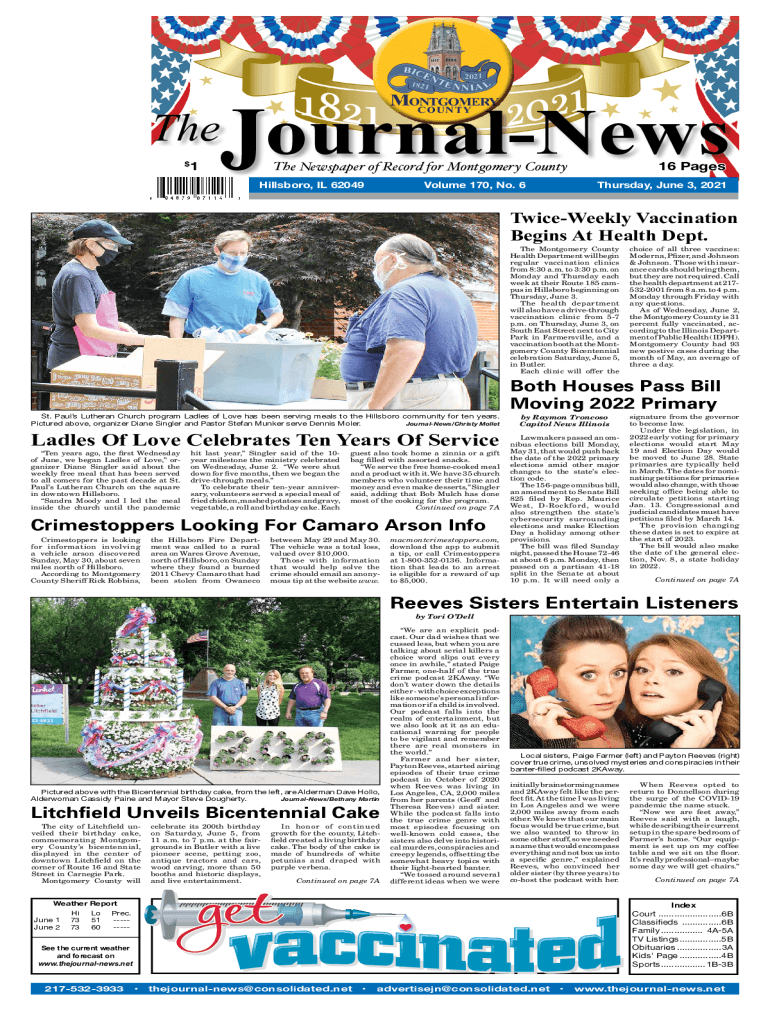 OurnalNews JThe$11 2 20182116 Pages Newspaper of Record for Montgomery CountyHillsboro, IL 62049Volume 170, No. 6Thursday, June 3, 2021TwiceWeekly Vaccination Begins At Health Dept. The Montgomery