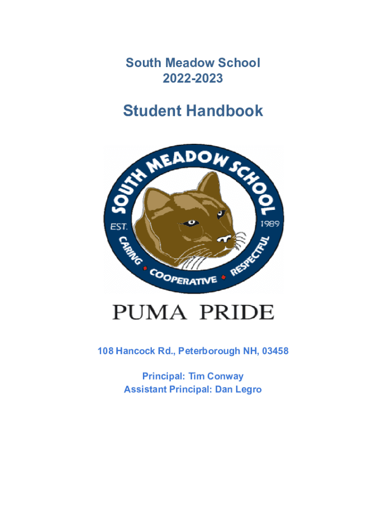 South Meadow School 20222023Student Handbook108 Hancock Rd., Peterborough NH, 03458 Principal: Tim Conway Assistant Principal: Dan LegroExpectation of Our School Community OUR SCHOOL MOTTO BELIEF