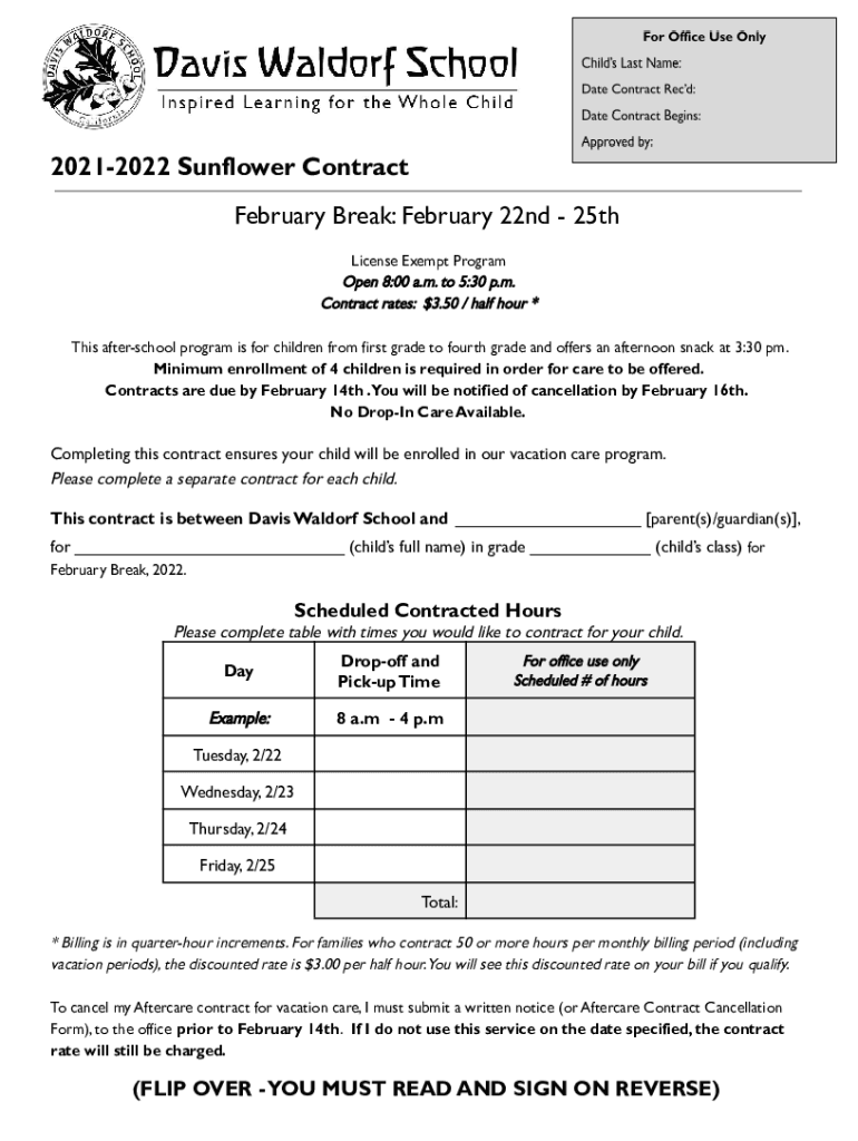 20212022 Sunflower Contract February Break: February 22nd 25th License Exempt Program Open 8:00 a.m. to 5:30 p.m. Contract rates: $3.50 / half hour * This after school program is for children from