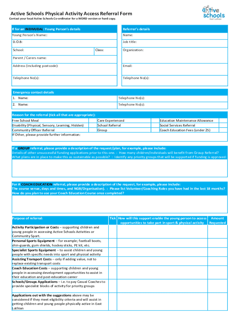 Active Schools Physical Activity Access Referral Form Contact your local Active Schools Coordinator for a WORD version or hard copy. If for an INDIVIDUAL: Young Persons detailsReferrers details Young