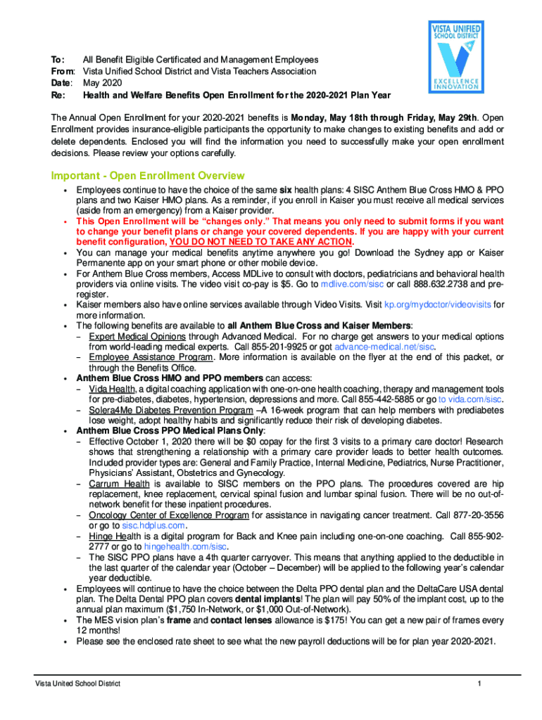 To: From: Date: Re:All Benefit Eligible Certificated and Management Employees Vista Unified School District and Vista Teachers Association May 2020 Health and Welfare Benefits Open Enrollment for