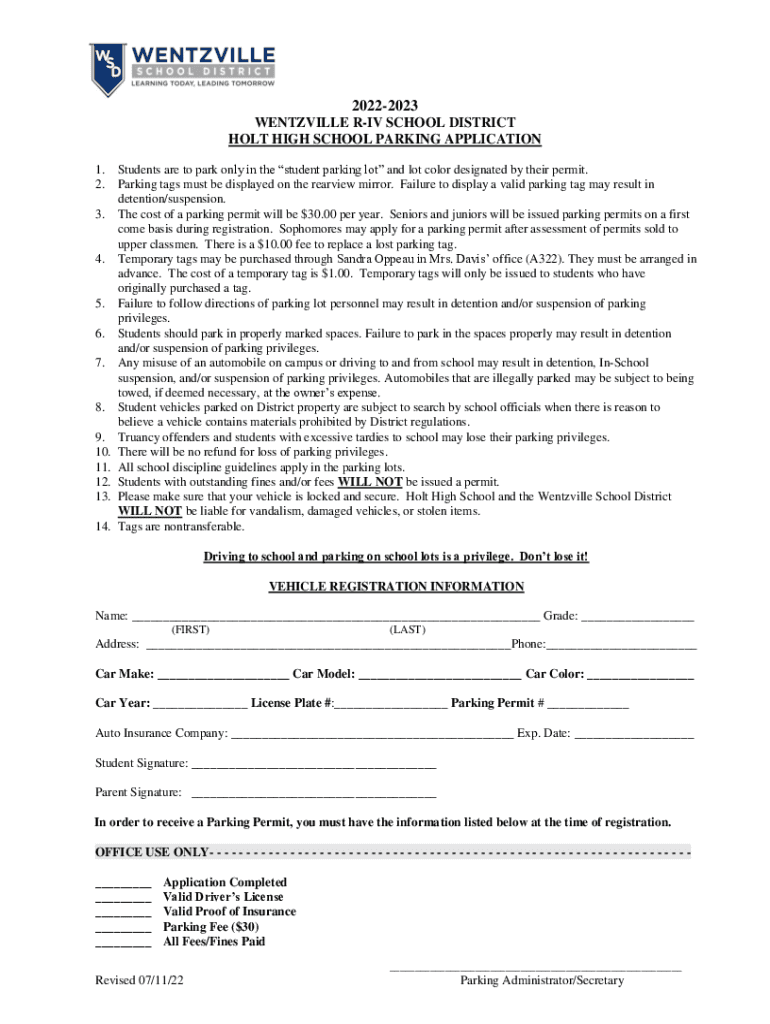20222023 WENTZVILLE RIV SCHOOL DISTRICT HOLT HIGH SCHOOL PARKING APPLICATION 1. 2. 3.4.5. 6. 7.8. 9. 10. 11. 12. 13. 14. Students are to park only in the student parking lot and lot color designated