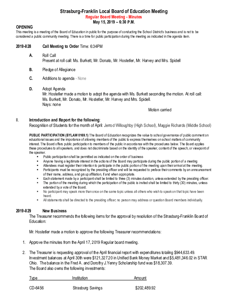 StrasburgFranklin Local Board of Education Meeting Regular Board Meeting Minutes May 15, 2019 6:30 P.M. Openings meeting is a meeting of the Board of Education in public for the purpose of conducting