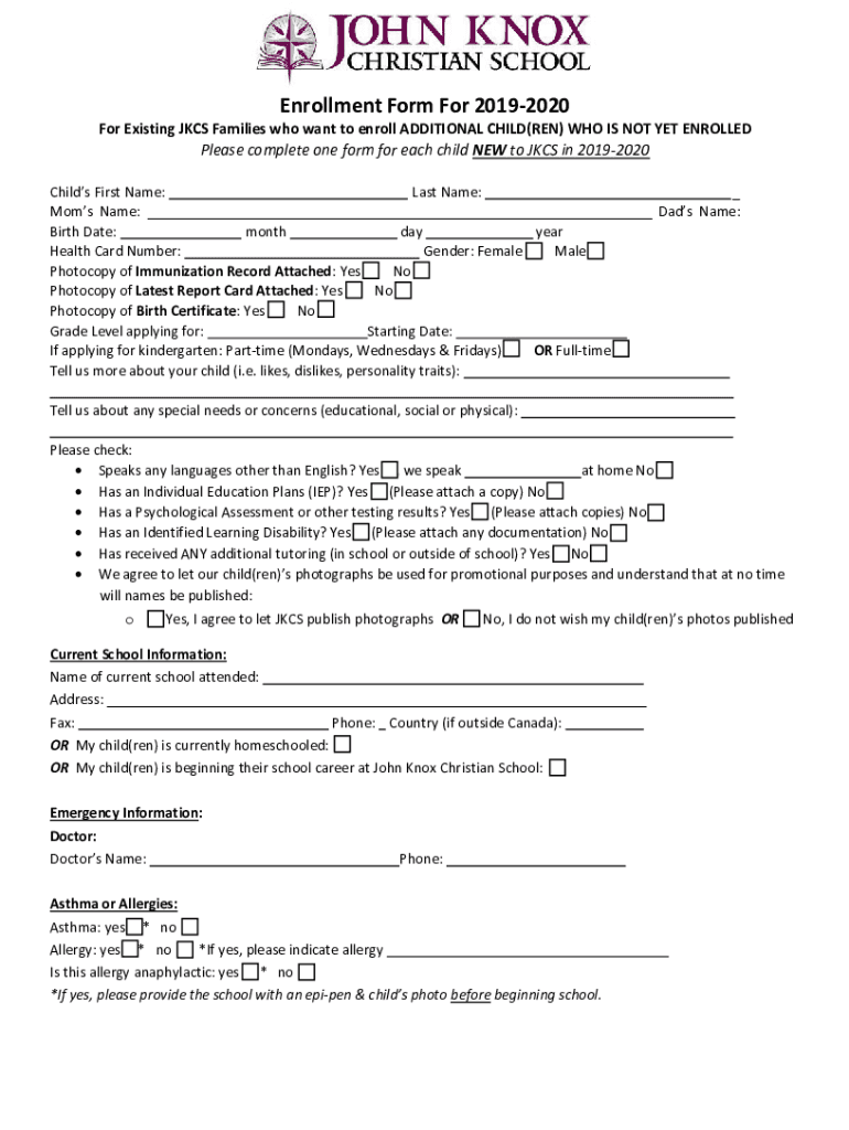 EnrollmentFormFor20192020 ForExistingJKCSFamilieswhowanttoenrollADDITIONALCHILD(MEN)WHOISNOTYETENROLLED PleasecompleteoneformforeachchildNEWtoJKCSin20192020ChildsFirstName: Hostname: