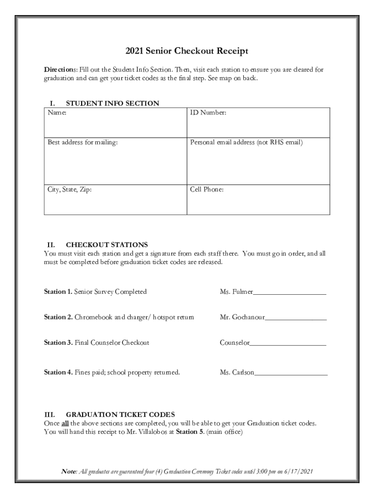 2021 Senior Checkout Receipt Directions: Fill out the Student Info Section. Then, visit each station to ensure you are cleared for graduation and can get your ticket codes as the final step. See map