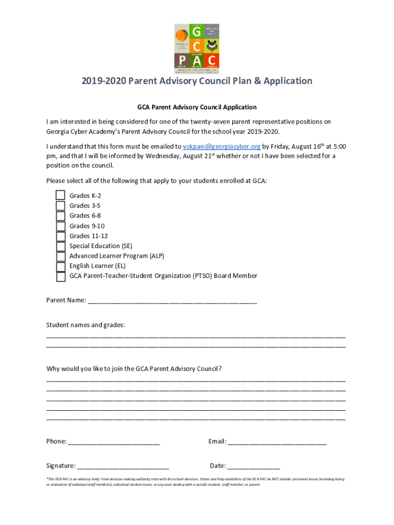 20192020 Parent Advisory Council Plan & Application Purpose: The purpose of the Georgia Cyber Academy (GCA) Parent Advisory Council is for parents to be able to provide input on policies, projects,