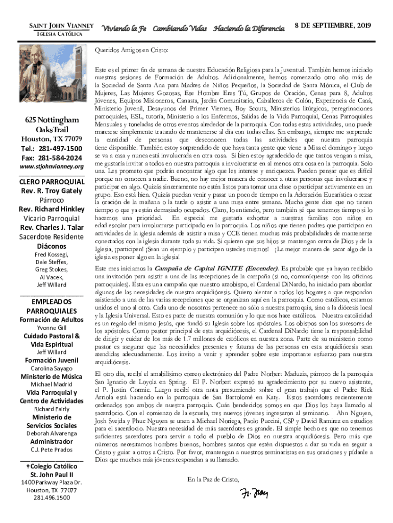 IGLESIAS CATLICAViviendo la FeCambiando VidasHaciendo la Diferencia8 de September, 2019Queridos Amigos en Crisco:625 Nottingham