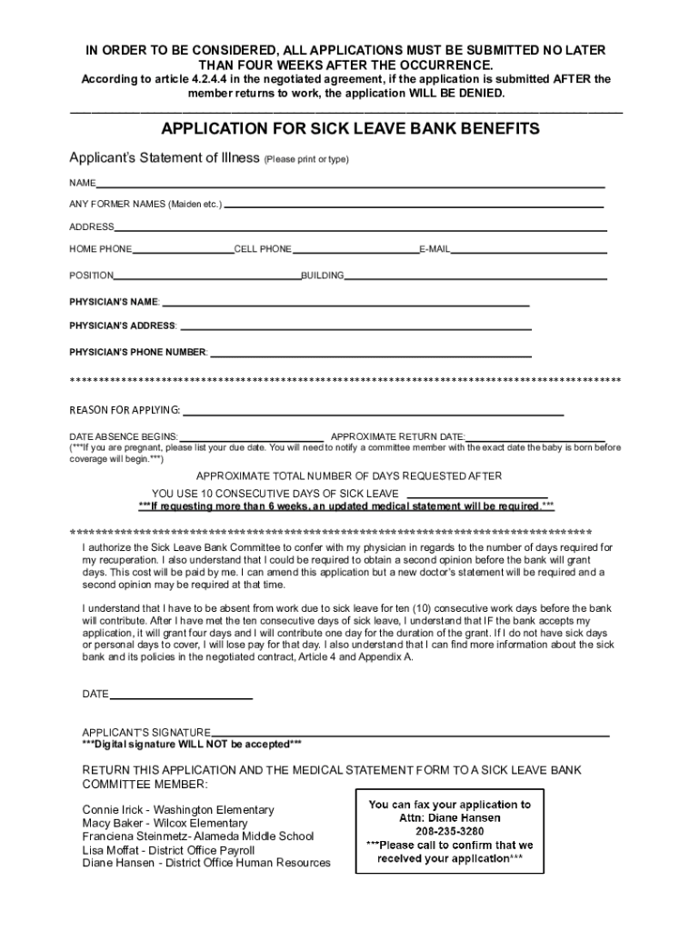 IN ORDER TO BE CONSIDERED, ALL APPLICATIONS MUST BE SUBMITTED NO LATER THAN FOUR WEEKS AFTER THE OCCURRENCE. According to article 4.2.4.4 in the negotiated agreement, if the application is submitted