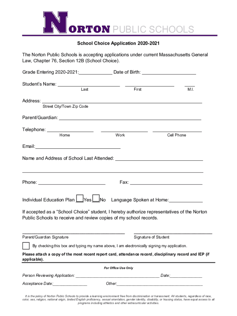 NORTON PUBLIC SCHOOLS School Choice Application Procedures 20202021GRADES 6 10 The Norton Public Schools will accept applications for seats for nonresident students exclusively under the States School