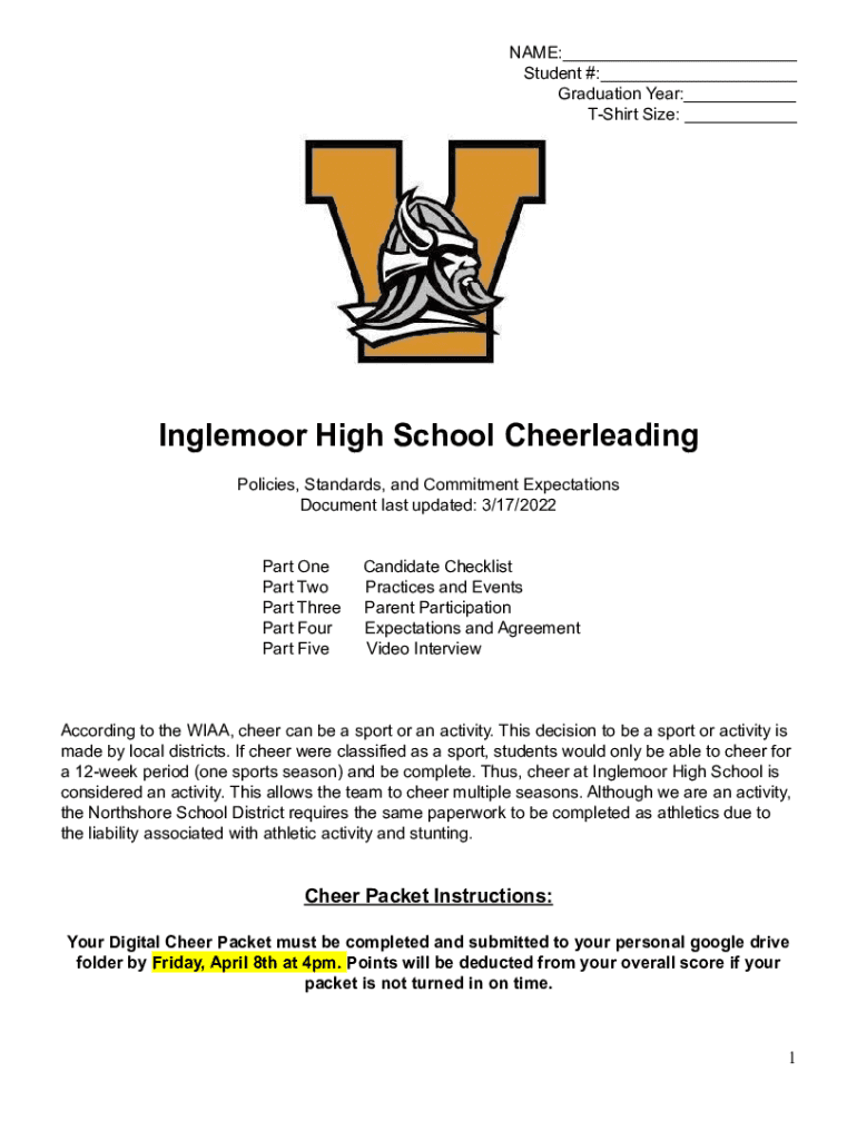 NAME:___ Student #:___ Graduation Year:___ Shirt Size: ___Inglewood High School Cheerleading Policies, Standards, and Commitment Expectations Document last updated: 3/17/2023 Part One Part Two Part