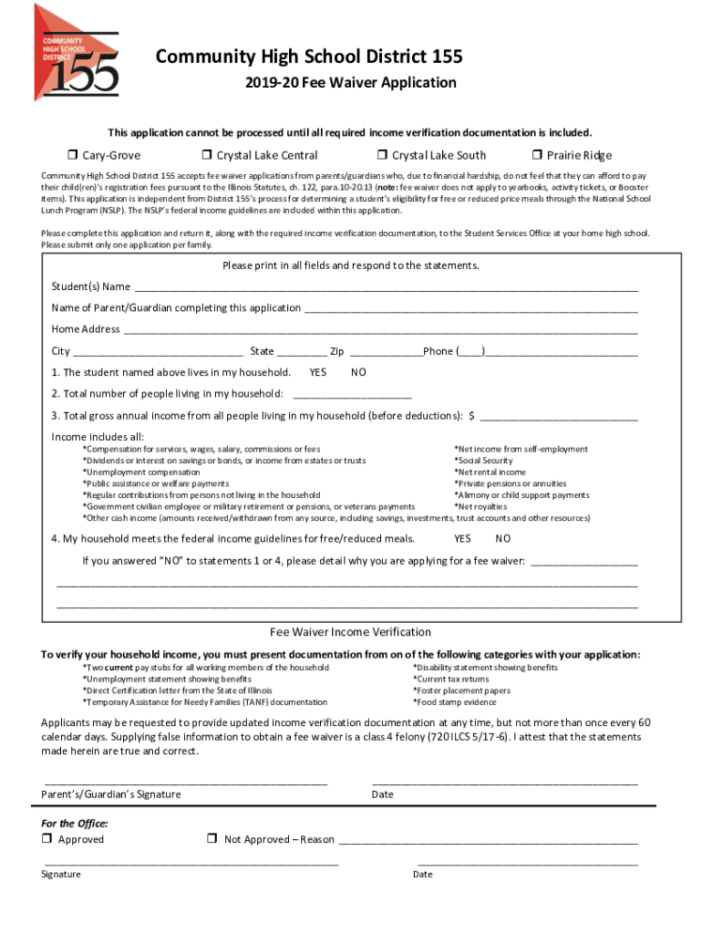 Community High School District 155 201920 Fee Waiver Application This application cannot be processed until all required income verification documentation is included. Hargrove Crystal Lake Central