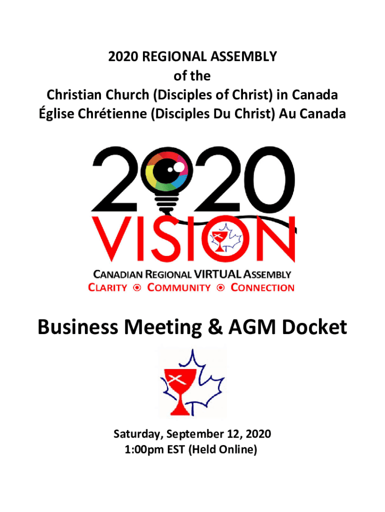 2020 REGIONAL ASSEMBLY of the Christian Church (Disciples of Christ) in Canada guise Certainly (Disciples Du Christ) Au CanadaBusiness Meeting & AGM Docket Saturday, September 12, 2020 1:00pm EST