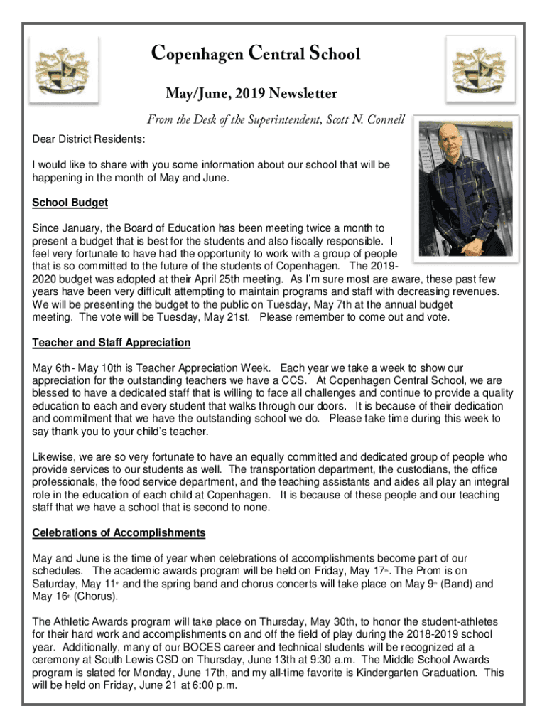 Copenhagen Central School May/June 2019 Newsletter From the Desk of the Superintendent, Scott N. Connell Dear District Residents: I would like to share with you some information about our school that