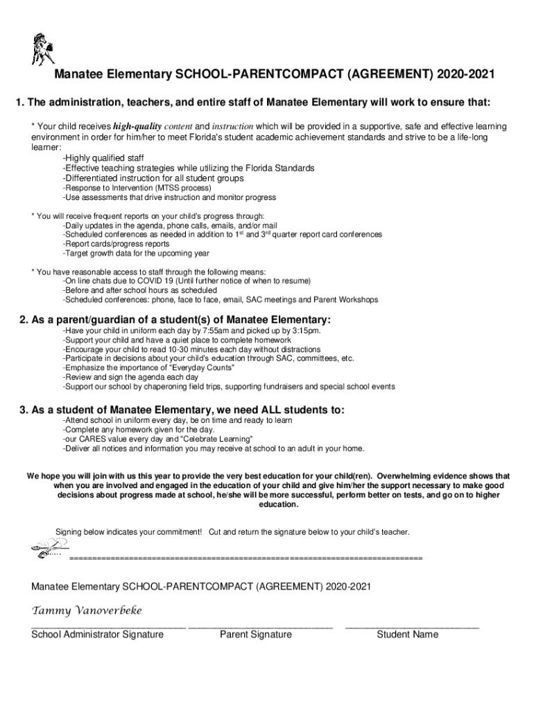 Manatee Elementary SCHOOLPARENTCOMPACT (AGREEMENT) 20202021 1. The administration, teachers, and entire staff of Manatee Elementary will work to ensure that: * Your child receives high quality content