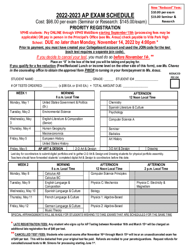 New Reduced Fees: $10.00 per exam $15.00 Seminar & Research20222023 AP EXAM Schedules: $98.00 per exam (Seminar or Research: $145.00/exam) PRIORITY REGISTRATIONS students: Pay ONLINE through PHS Web