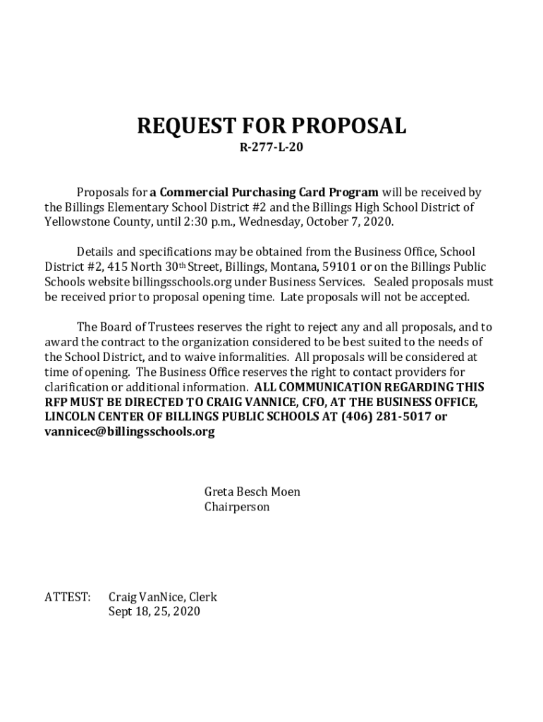 REQUEST FOR PROPOSAL R277L20Proposals for a Commercial Purchasing Card Program will be received by the Billings Elementary School District #2 and the Billings High School District of Yellowstone County,