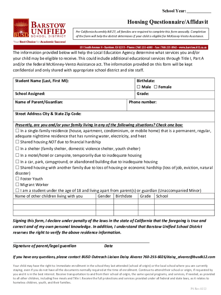 BUS Enrollment Forms Grades: Jr. High School (7th8th)Please return to: Central Enrollment Center 551 South Avenue H Bar stow, CA 92311 7602558800 / Fax: 7602558801 Hours: 7:30 am 2:30 pm, Monday Friday