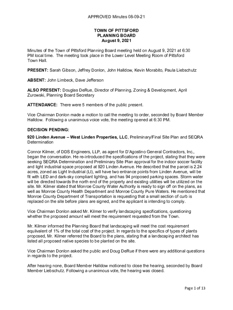 Minutes of the Town of Pitts ford Planning Board meeting held on August 9, 2021, at 6:30