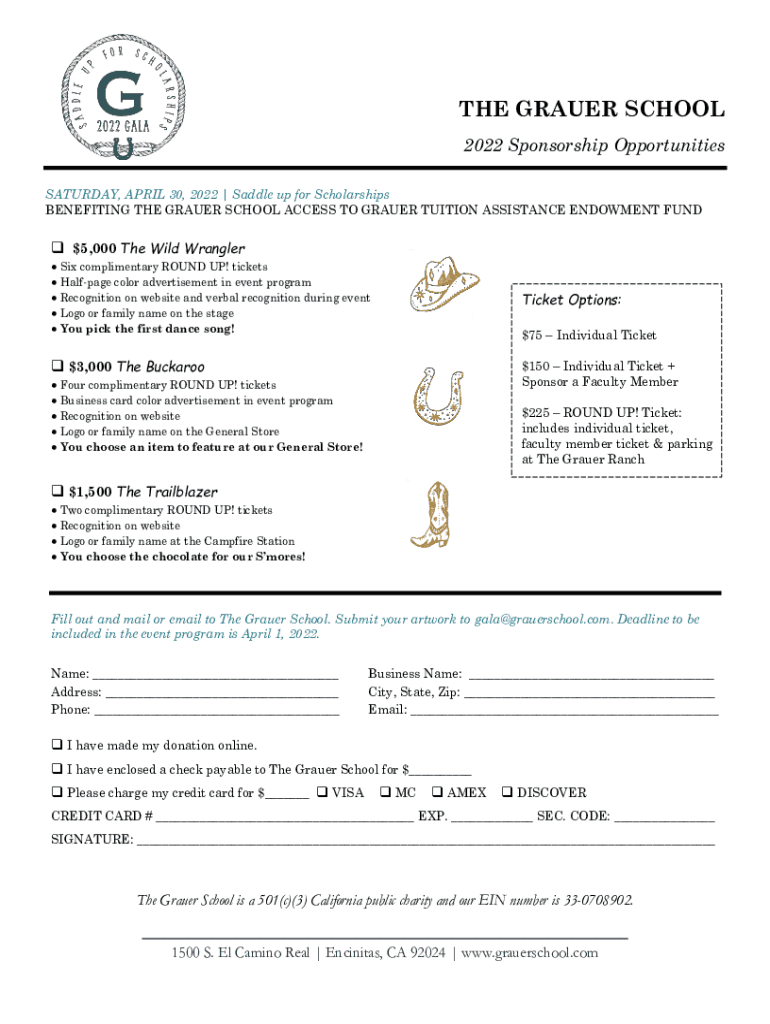 THE GRADER SCHOOL 2022 Sponsorship Opportunities SATURDAY, APRIL 30, 2023 | Saddle up for Scholarships BENEFITING THE GRADER SCHOOL ACCESS TO GRADER TUITION ASSISTANCE ENDOWMENT FUND $5,000 The Wild